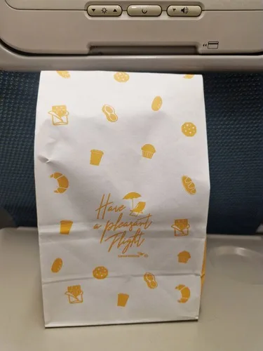Akonáhle piloti vypli bezpečnstné pásy, letušky nabehli s vozíkmi a začali rozdávať malé papierové sáčky. Po otvorení balíka som zistila, že sa tam nachádza voda, žemlu, balíček s orechami a vlhkú utierku. Po otvorení balíka s orechmi som objavila iba strukoviny ako cícer a kukuricu.